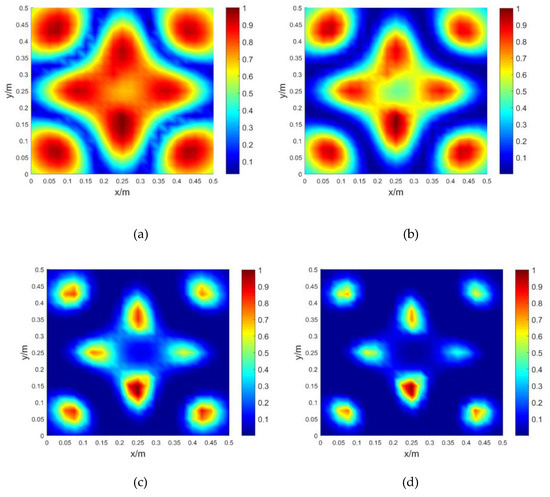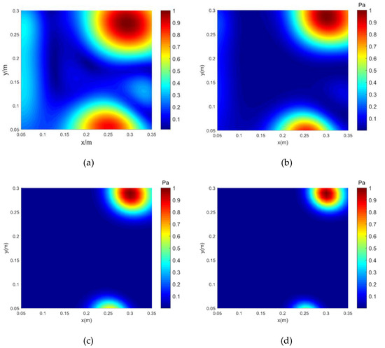 Figure 13. Pressure distributions under experimental conditions of (a) ERDCESM with ν = 0 , (b) ERDCESM with ν = 1 , (c) ERDCESM with ν = 3 and (d) ERDCESM with ν = 5 for a plate sound source at 500 Hz.
