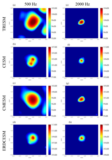 Figure 10. The Experimental results of (a) TRESM map at 500 Hz, (b) CESM map at 500 Hz, (c) CMESM map at 500 Hz, (d) ERDCESM map at 500 Hz, (e) TRESM map at 2000 Hz, (f) CESM map at 2000 Hz, (g) CMESM map at 2000 Hz and (h) ERDCESM map at 2000 Hz for a single source.