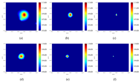 Figure 11. Pressure distributions under experimental conditions of (a) ERDCESM with ν = 0 at 500 Hz, (b) ERDCESM with ν = 1 at 500 Hz, (c) ERDCESM with ν = 3 at 500 Hz, (d) ERDCESM with ν = 0 at 2000 Hz, (e) ERDCESM with ν = 1 at 2000 Hz and (f) ERDCESM with ν = 3 at 2000 Hz for a single source.