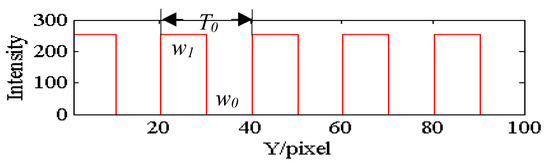 In the traditional phase measuring profilometry (PMP) based on binary fringe projection [32], the traditional binary fringe is shown in Figure 1. The width for non-zero transmittance () of the binary fringe is always encoded the same as that for zero transmittance () in one period () as shown in Figure 1. The corresponding sinusoidal fringe pattern can be approximated by properly defocusing the binary fringe [29] or using the nonlinear error suppression of the large-step PMP based on binary fringe projection [30]. The duty cycle can be expressed as