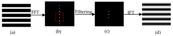 The corresponding sinusoidal fringe pattern extracting process is show in Figure 2. When the encoded binary fringe is projected onto the reference by the HDLP, the fringe pattern is captured by a high frame rate complementary metal oxide semiconductor (CMOS) monochrome camera, as shown in Figure 2a. By fast Fourier transform (FFT), its Fourier spectrum is shown in Figure 2b, it can be seen that although there many higher order harmonic frequencies existed in the frequency domain, the Fourier spectrum distribution is discrete. By introducing a proper rectangular window low-pass filter, the frequency components contained the sinusoidal fringe pattern information as shown in the dotted box in Figure 2b can be retained as shown in Figure 2c. By inverse Fourier transform (IFT), the nearly unbroken sinusoidal fringe pattern (see Figure 2d) can be extracted efficiently. In the same way, the nearly unbroken sinusoidal deformed pattern also can be extracted from the captured deformed pattern when the encoded binary fringe is projected onto the measured object.