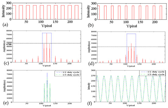 The traditional 1/2 duty cycle binary fringe and the 1/3 duty cycle binary fringe as shown in Figure 3a,b, respectively, are taken as an example. In this example, their image sizes are all 300 pixels × 300 pixels. By FFT for them, their corresponding Fourier spectrums are shown in Figure 3c,d, respectively; it can be seen that the second order harmonic frequency spectrum vanishes in the traditional binary fringe but exists in the 1/3 duty cycle binary fringe. Although the second order harmonic frequency spectrum exists in the 1/3 duty cycle binary fringe, its proportion is small enough. It means that the shape reconstruction error caused by the second order harmonic frequency spectrum is small enough. According to Equation (7), it can also be seen that the amplitude of the fundamental frequency spectrum in traditional binary fringe is 4700 and that of the 1/3 duty cycle binary fringe is 4000 from Figure 3c,d. But if the zero frequency spectrums and the fundamental frequency spectrums in Figure 3c,d are filtered out respectively by introducing a proper rectangular window low-pass filter as shown in the rectangle box in Figure 3c,d with the above-mentioned process, it can be seen that these retained frequency spectrum components’ distributions contained the sinusoidal fringe information are similar. Then they aligned the same amplitude of the fundamental frequency spectrum by simply multiplying the latter spectrum with 4700/4000, it is found that the aligned frequency spectrums are very similar to those shown in Figure 3e. It reveals that the 1/3 duty cycle binary fringe has the same effect as the traditional binary fringe. By IFT for the aligned frequency spectrums in Figure 3e respectively, the corresponding nearly unbroken sinusoidal fringe patterns can be efficiently extracted from the traditional binary fringe and the 1/3 duty cycle binary fringe respectively. Figure 3f show the cutaway views of the extracted sinusoidal fringe patterns in one columns, it can be seen that the transmittance function of the sinusoidal fringe pattern extracted from the 1/3 duty cycle binary fringe is much close to that of the traditional binary fringe. Furthermore, it also reveals that the reconstructed phase information of the measured object by using the 1/3 duty cycle binary fringe can be close to that of traditional binary fringe.