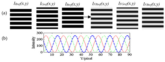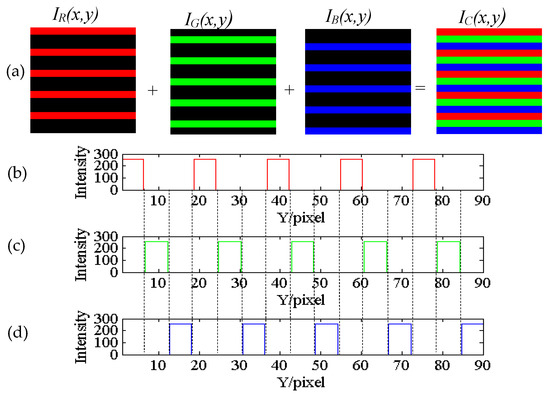 In order to realize dynamic 3D shape measurement with the introduced binary fringe, a tricolor binary fringe is designed as shown in Figure 4a in which its R, G, and B components are encoded by three monochromatic binary fringes with the same duty cycle of 1/3 but shifted 1/3 period one by one. It can be seen that R, G and B components of the encoded tricolor binary fringe share the same fringe width of 1/3 periods and are independent without any color overlapping in the non-zero regions one by one as shown in Figure 4b–d, so the encoded tricolor binary fringe can avoid the color overlapping problem in the traditional composite color sinusoidal fringe. The mathematic model of the tricolor binary fringe can be expressed as