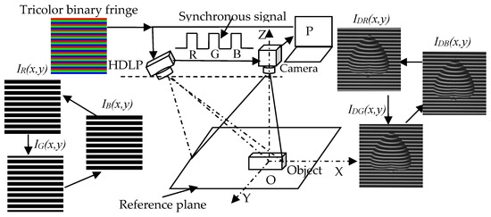 While measuring, under the same condition above-mentioned, the HDLP projects the encoded tricolor binary fringe in R, G, and B channels (, , and ) onto the measured object separately and sequentially at three times of dynamic frame rate, the corresponding three deformed patterns (, , and ) from R, G, and B channels can be captured by the high frame rate CMOS monochrome camera synchronized with the HDLP as shown in Figure 5. In the same way as discussed in Section 2, the captured three deformed patterns—, , and —which were processed the corresponding extracted nearly unbroken sinusoidal deformed patterns , , and can be expressed as
