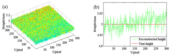 At the same time, in order to show the details of the above measured planes used for calibration, the reconstructed result for measuring the plane with height of 5.00 mm is shown in Figure 12a, it can be seen that the reconstructed 5.00 mm plane’s surface is relatively much smooth with the proposed method. In order to show the accuracy of the reconstructed 5.00 mm plane in detail, the corresponding cutaway view at 150 column from 1 to 300 rows in Figure 12a is shown in Figure 12b, it can be seen that the height of the reconstructed 5.00 mm plane is between 4.925 mm and 5.077 mm which is consistent with the measuring result of 5.00 mm plane in Table 1: it effectively verified that the proposed method has higher measuring accuracy.