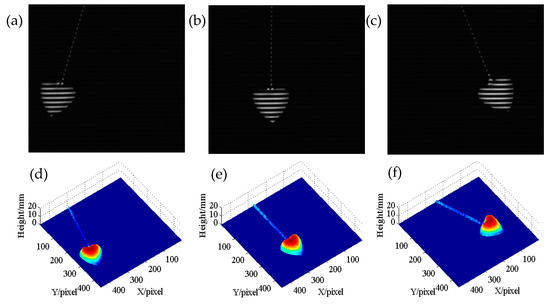 In order to verify the effectiveness and the practicality of the proposed method for measuring the 3D shapes of dynamic object, several experiments are conducted. One of them is to measuring the swinging “heart” model. The deformed patterns of the swinging “heart” model, in different states, are captured at 78 fps. The corresponding reconstructed 3D shapes of the swinging “heart” model are reconstructed with the proposed method. Figure 13a–c show three states (state 1, state 2, and state 3) of the captured deformed patterns from R channel. The corresponding reconstructed 3D shapes at above three states are shown in Figure 13d–f. It can be seen that the 3D shapes of the measured swinging “heart” model at different states can be also well reconstructed with the proposed method. Therefore, the proposed method is effective for measuring the dynamic objects. If the higher frame rate camera and HDLP are used, the deformed patterns contained the 3D shape information of the measured dynamic object will be obtained at higher speed, the proposed method has potential application in superfast, dynamic 3D shape measurement. Although, with the additional Fourier transform, low-pass filtering, and inverse Fourier transform used in the proposed method, which may be for more time consuming, the proposed method can realize dynamic 3D shape information acquisition. If the graphic processing unit (GPU) acceleration calculation technique [37] is used in the proposed method, it will make the proposed method realize the real-time dynamic 3D shape reconstruction which is into our further research.