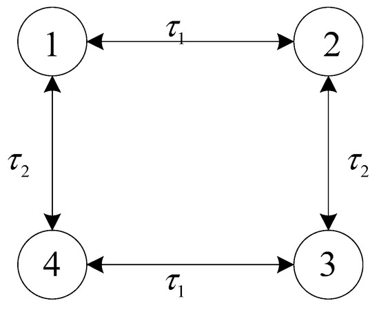 As can be seen from Figure 1, the time delay between robots 1 and 2 is , between robot 2 and robot 3 it is , between robot 3 and robot 4 it is , between robot 4 and robot 1 it is . If the adjacent communication weight is 1, then the Laplace matrix is: