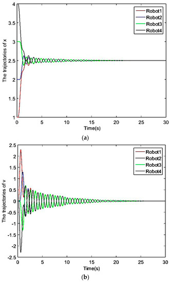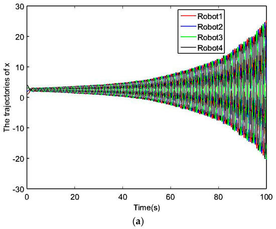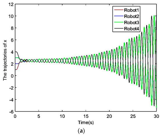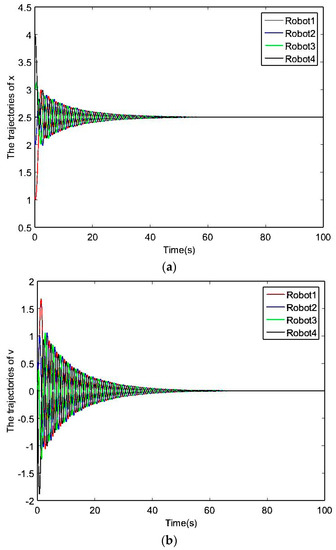 In the first group of experiment 2, set , , , , and the initial posture is assumed to be (1,0), (2,0), (3,0), (4,0). The simulation results are shown in Figure 5.