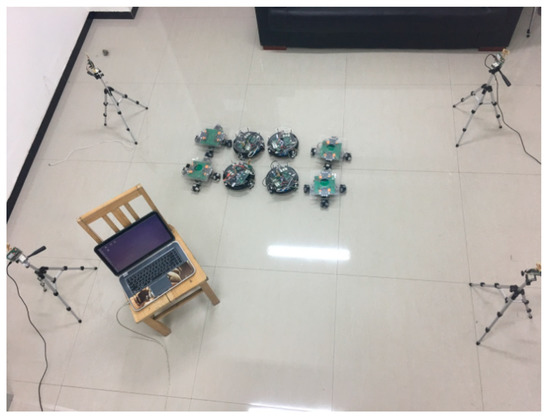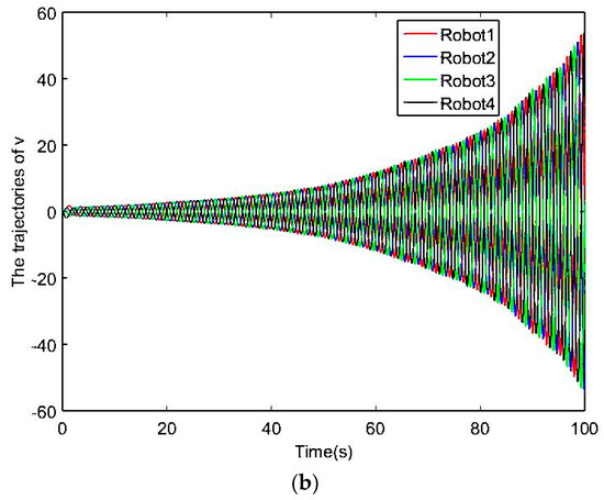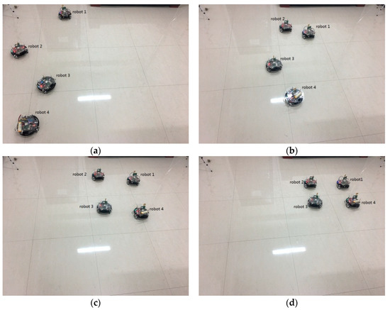 It should be pointed out that when the proposed algorithm is applied to a practical multi-robot system, it is necessary to first determine the maximum communication delay between robots and the maximum amplitude of the noise environment, and then design and based on this. At the same time, it should be noted that this experiment mainly focuses on verifying whether the system can achieve consensus under the control law. The collision avoidance behavior of the multi-robot system is not the emphasis in this research. Therefore, the collision avoidance algorithm program is written in the bottom control program of the robot in this experiment. When the robot is about to collide, the formation algorithm program will be interrupted, and the collision avoidance behavior will be executed. When a safe distance between the robots has been reached, the formation algorithm program will continue to be executed [17,18].
