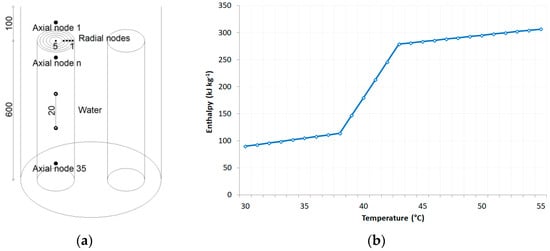The tank was modeled to be made of stainless steel, 700 mm height, 350 mm diameter, 1 mm thick, water inlet at 700 mm height, and outlet at the bottom base, in order to validate it with previously measured experimental data [,,]. The tank was vertically divided into 35 water nodes (derivatives) and 30 PCM nodes, so axial nodes are 2 cm apart each other (Figure 1a).