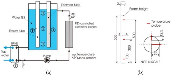 The experimental test rig presented in Figure 2 was already described in previous works of the authors [,,]. However, for reader’s convenience, the main characteristics of the experimental setup are reported here. It is designed to study the heat transfer performance of PCMs with and without Al foam as a heat transfer medium in hybrid water TESs. The temperature of the water in the tank was kept at the desired value by controlling the electrical power and the water flow rate. The hot water coming from the 70 L water tank first passed through a brazed plate heat exchanger (BPHE) to be cooled down by tap water, and then it was pumped into an electrical heater (9 kW) driven by a PID (Proportional, Integrative, Derivative) regulator. Then it entered again into the water tank. As illustrated in Figure 2, two similar tubes could be tested at the same time, both containing around 1 kg of paraffin wax, but only one was implementing the enhanced surface. Both tubes were tested at constant water temperatures in order to monitor and to directly compare the loading and unloading times, and to study the effects of Al foams on the heat transfer performance during the solid–liquid phase change of the paraffin wax.