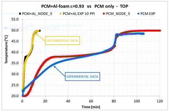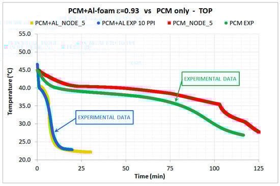 As described in a previous work [], the results of the simulations of the axial nodes of the tubes are consistent with the experimental results, as reported by Figure 3 for a porosity of 0.93. The melting process of the solid phase started at 38 °C, ending at around 43 °C; the diagram highlights the strong reduction in melting time when Al-foams are used with respect to the empty tube.