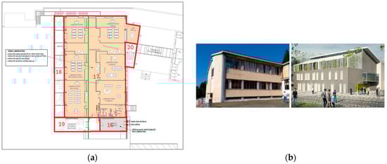 The retrofitting intervention and definition of thermal zones for the second floor (a); building as is and post-intervention (b).