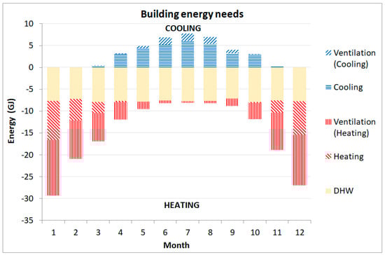 The maximum cooling load (21.6 kW) occurs at the beginning of June, when the school is still fully operating, that is, it is open to students and professors, and gyms are open to extracurricular activities as well. The maximum heating load (−44.6 kW) occurs in the second half of January. However, even during summer months, post heating ventilation requires some heat. During the heating season, ventilation needs are prevailing with respect to heating needs; this is a consequence of the very high thermal insulation of the retrofitted building and of the minimization of thermal bridges. Moreover, DHW needs (2000 L per day at 45 °C) are a large quota of the total heat request.