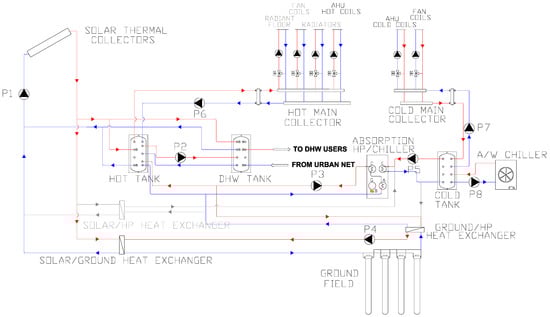 For the sake of simplicity, a reduced functional diagram of the plant is shown in Figure 8. The HVAC system in the large gym provides space heating by means of a radiant floor, and space cooling by air conditioner units, while ventilation is realized by means of an air handling unit (AHU) (6600 m3 h−1) serving a single-duct system. The other spaces (small gym, bar, laboratories, and offices) are heated and cooled by fan coils, whereas toilets are heated only (by radiators), and laboratories are served also by an independent AHU (7000 m3 h−1) for ventilation. The two AHUs are equipped with heating and cooling coils, served by hot and cold main collectors in the central plant.