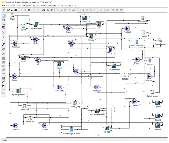 The thermal source for the heat pump can be either the ground or solar collectors. The former was set up by nx100 m in a row of vertical tube U heat exchangers with an outer diameter of 32 mm and a thickness of 2.9 mm (n = 2-3-4 as a function of the solar field area as described in Section 3). Evacuated tube and flat plate collectors were considered in the simulation (Table 3). Solar collectors first served the DHW tank, then the hot tank (for direct heating), and finally regenerated the ground. Table 4 reports the rated electric consumption of the main circulation pumps, computed after an evaluation of pressure drops along the different circuits. A schematic of the Trnsys project of the HVAC plant model is reported in Figure 9.