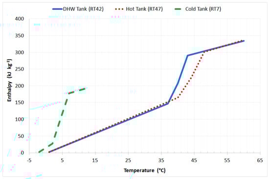 The values of the main parameters of type 860 simulating the three hybrid water–PCM thermal storage tanks are reported in Table 6. The dimensions of the tanks refer to real data from suppliers. The PCM thermal conductivity was fixed as described in previous Section 2.1.1. The thickness of PCM tubes was supposed to be negligible, whereas their number was fixed, allowing a suitable space between each other in order to avoid the risk of laminar water flow around them. Figure 10 reports the enthalpy–temperature curve for the PCMs used in the three tanks. The commercial paraffin waxes Rubitherm® RT47, RT42, and RT7 are used for the hot, DHW, and cold tanks respectively, with phase change temperatures centered in the most suitable range for each tank.