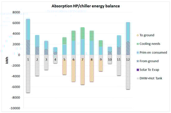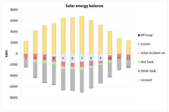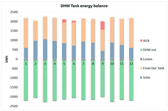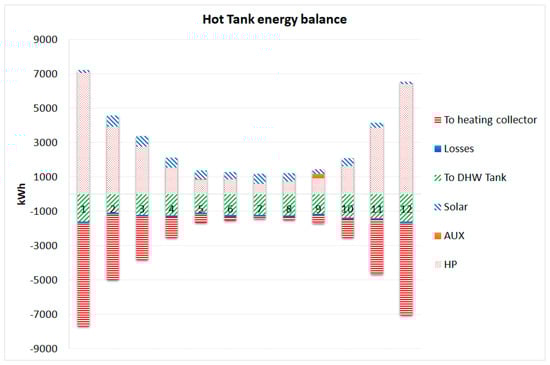 Figure 13 and Figure 14 report the energy balance of the DHW tank and hot tank, respectively. Solar energy was assured an appreciable contribution to DHW demand, even if the hot tank contribution prevailed above all in the colder months.