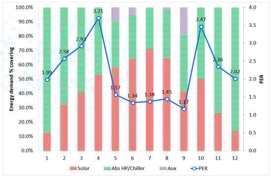 During winter months, PER was always greater than 1.94, and that was the nominal value of the HP GUE. The heat pump covered the largest fraction of heating and DHW demand. During summer months the lowest values of PER were reported. This was due to the low GUE of the absorption machine in chiller mode, and to the low contribution of the heat recovered by the chiller to the heating and DHW demand. As a matter of fact, the demand was largely satisfied by solar energy.