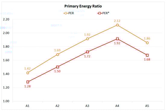 From the energy performance point of view, the best solution was A4 (PER = 2.12, PER* = 1.92), whereas A3 was in second place.