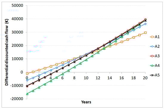 Annual discounted differential cash flows between the A1–A5 alternatives and the traditional one (A0).
