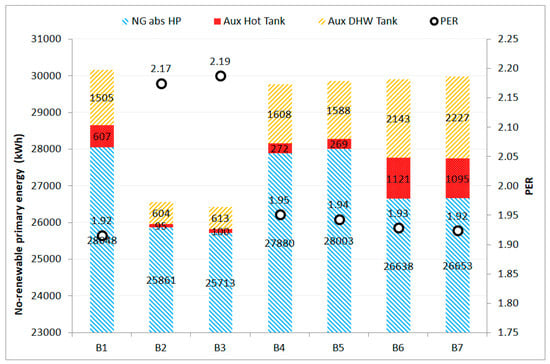 Figure 15 reports the percentage covering of different heat generators (solar collectors, absorption HP, and electric auxiliaries), and the primary energy ratio (PER) for the A3 alternative. PER is defined as the ratio between useful energy produced by the plant (energy from the three tanks to the main collectors of Figure 8) and the total no-renewable requested primary energy. The latter includes natural gas (NG) supplied to the absorption machine, and electricity to the auxiliaries of the hot tank and DHW tank. According to Italian standard DM 26/06/2015, such electricity consumptions are converted to primary energy by the no-renewable primary factor fp,nren = 1.95.