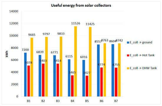 Useful solar radiation from thermal collectors to ground, hot tank and DHW tank.