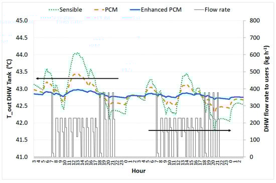Temperature and flow rate of water at the outlet of the DHW tank in the case of sensible (water), phase change materials (PCM), and the enhanced PCM DHW tank.