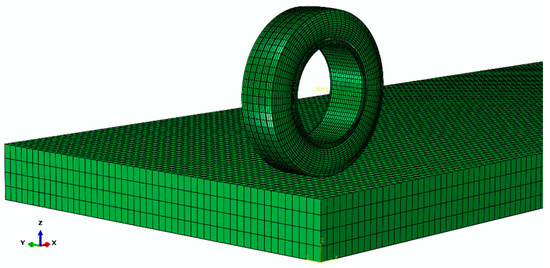 Since the rubber material, which makes up the tire tread, has extremely complex characteristics, it is usually defined as the isotropic, incompressible and hyper-elastic material in the model. The Mooney–Rivlin material model is used in this section to describe the constitution of rubber and the material parameters of each component, as shown in Table 1 [26,27]. When modeling, the steel wires of the cord layer and belt layer are simulated by a rebar unit, which is firstly defined on the surface unit and then embedded into the corresponding entity unit of rubber. The tread and carcass of the tire are constrained by a tie. The rim, which is not deformed, is rigidly coupled with the central point of carcass’ rotation axis, thus it can move with the tire carcass. The finite element models of the tire and pavement are shown in Figure 2. To clarify, the kingpin inclination and caster are usually not considered in 3D finite element models to simplify the models and facilitate calculation, and the tire just rolls and deflects around the central point which is coupled with the periphery of the rim.