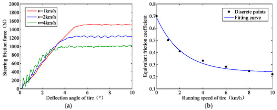 Table 2 also shows the equivalent friction coefficient at different corresponding speeds, which was obtained through dividing the steering friction force by the vertical load. Subsequently, the data in Table 2 are fit in the form of (, , are the fitting coefficients) [28], according to the variation trend and the fitting curve, which is shown in Figure 3b. Finally, the function of the equivalent friction coefficient with running speed is: