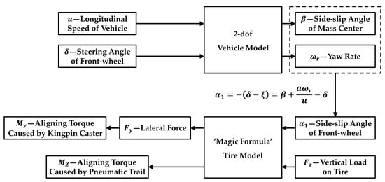 Due to the centrifugal effect, the lateral force exists at the center of steered wheel when the vehicle steers. Accordingly, the lateral reaction force , which is also known as the cornering force, is generated by the pavement on the steered wheel. The cornering force produces the aligning torques which is related to the kingpin caster trail and pneumatic trail. The detailed solution procedure of the aligning torques caused by the kingpin caster and pneumatic trail is shown in Figure 6. The 2-degree-of-freedom (2-dof) vehicle dynamic model is employed here to calculate the ideal side-slip angle and yaw rate. It can also be used to identify and estimate the actual side-slip angle. Under the 2-dof vehicle model, the lateral force and the aligning torque are considered acting on the front axle as a whole, which is consistent with the processing ideas in the calculation of and in Section 4.1 and Section 4.2.