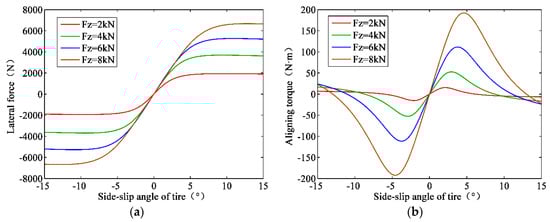 Under a single steering condition, the coefficients of the ‘Magic Formula’ can be referred to in the literature [33]. The curves of the lateral force and the aligning torque caused by the pneumatic trail with the side-slip angle of the tire are drawn according to Equation (14) in the MATLAB, which are shown in Figure 7a,b.