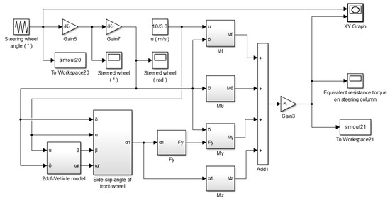 The simulation models of the pivot and low-speed steering resistance torque are respectively established in the MATLAB/Simulink environment according to Equation (16). In the simulation models, the input signal is the steering wheel angle which is simulated by a periodic signal of triangular wave, and the output signal is the equivalent resistance torque applied on the steering column. Moreover, the equivalent resistance torque on the steering column and steering resistance torque have the following relations: