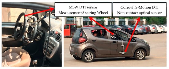 The experimental apparatus mainly included the MSW DTI sensor-Universal measurement steering wheel and the Correvit S-Motion DTI Non-contact optical sensor. Detailed information on the main experimental apparatus is shown in Table 3. When the driver turned the measurement steering wheel, which is tightly mounted on the vehicle steering wheel through brackets, the real-time steering wheel torque/angle could be measured. The Correvit S-Motion DTI Non-contact optical sensor was fixed on the vehicle door by suckers. After relevant parameters were configured, the real-time vehicle speed, lateral acceleration and yaw rate could be measured in the process of vehicle movement. The experimental apparatus was connected to the power supply and the notebook computer, and all the measured data were recorded by DEWESoft software in the computer.