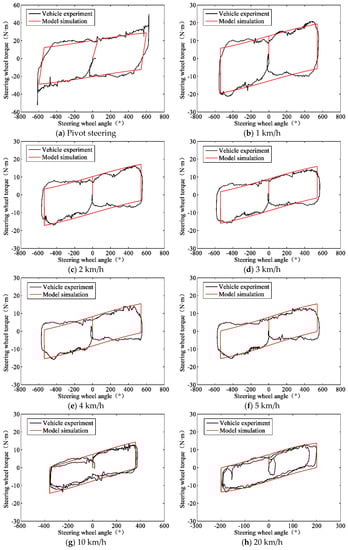 Thus, the measured steering wheel torque and the simulated equivalent resistance torque on the steering column can be contrasted to verify the accuracy of the low-speed steering resistance torque model. The comparative results are shown in Figure 10. For the pivot steering experiment, the driver turned the measurement steering wheel with a constant speed when the vehicle was under a static state, causing the steering wheel to reach the limit positions on two sides. As a result, there are two mutations on the curve in Figure 10a. For the low-speed steering experiments, the driver turned the measurement steering wheel when the vehicle maintained a state of uniform linear motion at different speeds (1 km/h, 2 km/h, 3 km/h, 4 km/h, 5 km/h, 10 km/h, 15 km/h and 20 km/h). The steering wheel did not reach the limit position on either side for safety. Therefore, it is round at the corner of the curves from Figure 10b–h. In addition, the decreasing height of these curve rings from Figure 10a–h, which means the steering resistance torque decreases with the vehicle speed. It can be seen from the figures that the simulation results are consistent with the experimental results, indicating that the established model of the steering resistance torque has a high accuracy.