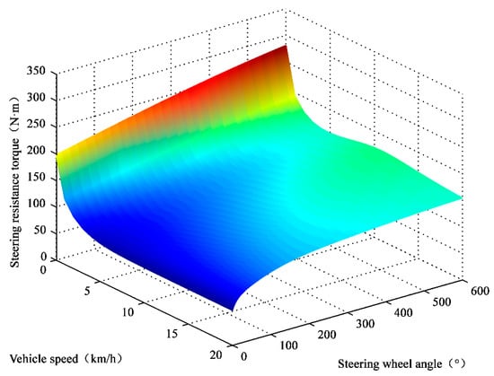 Furthermore, the surface plot of the low-speed steering resistance torque with the vehicle speed and steering wheel angle can be finally drawn based on the simulation results, as shown in Figure 11. It can be clearly seen from the figure that the change laws of the low-speed steering resistance torque are as follows: