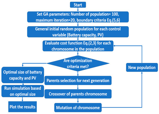 Flow chart of battery-Photovoltaic Genetic Algorithm (PV GA) optimization.