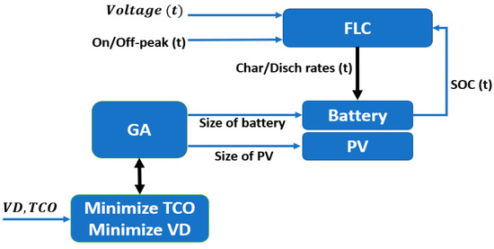 A proper energy management in SGs is necessary to maintain the supply-demand power balance. In this regard, the FLC has been implemented to the hybrid PV-battery system and is connected to the GA (see previous section), as shown in Figure 5. Briefly, the initial population (size of battery capacity and PV) is generated by the GA and then the generated population is forwarded to the model to calculate VD and TCO for one year. Note that the battery tries to reduce the VD and shift demand based on on/off peaks according to its size, while the TCO should be reduced according to the investment costs, purchased, sold electricity from/to the grid, and so forth.