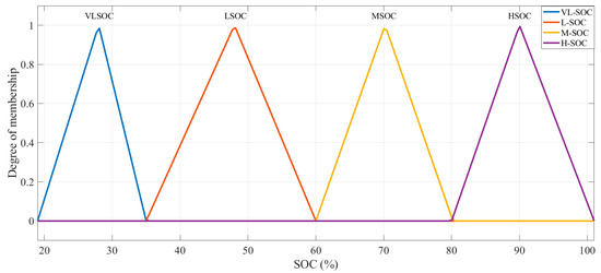 In order to consider the energy requirements that should be met by battery owners and that can be applied in different ways, it is important to limit the energy that is allowed for use in B2G and G2B operation, ensuring that the battery will not be completely depleted or overcharged. Thus, the SoC must be limited by two different thresholds to insure safety, longevity, and performance [42]. In the present study, the battery cannot discharge to less than 20% or charge to more than 100% of its capacity. Moreover, the input SoC is fuzzified into four ranges, as illustrated in Figure 6; ‘Very low SoC’ (VLSoC), referring to SoC between 20% and 35%, ‘Low SoC’ (LSoC), referring to SoC between 36% and 60%, ‘Medium SoC’ (MSoC) for SoC between 61% and 80%, and ‘High SoC’ (HSoC) for SoC between 81% and 100%.