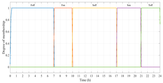 Integrating ESSs into the grid is considered to be the best strategy for peak shaving, which consists in providing or absorbing the power surplus, thereby shaving the total exchanged power [43]. In this way, the coordination of charging and discharging of batteries offers the opportunity to participate in Demand Side Management (DSM) to reduce the peak load demand in the grid and avoid the surplus of PV generation injection into the grid [44]. Thus, the on/off-peak hours and electricity prices should be considered and varied with the load demand to allow for the scheduled operation of the battery and reduce the gap between the power generation and the load demand. For these reasons, the implemented controller considers the on-peak and off-peak times and it considers an input membership ‘On/Off peak hours’, which is fuzzified into on-peak hours: from 7 a.m. to 10 a.m. and from 5 p.m. to 9 p.m., off-peak hours: from 10:01 a.m. to 4:59 p.m., and from 9:01p.m. to 6:59 a.m., as illustrated in Figure 8.