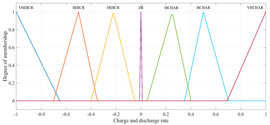 In order to gather the charging and discharging power rates of the BESS, an output membership function, ‘Char/Dischar rate’, is considered for the output of the fuzzy controller with seven ranges, as shown in Figure 9; very high discharge (VHD), high discharge (HD), medium discharge (MD), zero charge/discharge rate (ZR), medium charge (MC), high charge (HC), and very high charge (VHC).