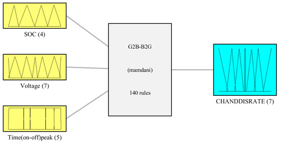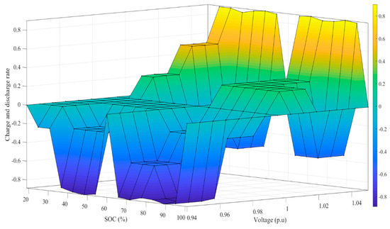 The input/output functioning memberships, as shown in Figure 10, result in 140 rules (see Appendix A, Table A1), ensuring all operating conditioning of the controller and the electric grid. For instance, if the battery has VLSoC and the voltage is VHP and the time is in the range of 0 a.m. to 7 a.m. (Foff), which corresponds to off-peak time, then the output membership function ‘Char/Dischar rate’ is VHC, and the battery charges with a very high rate. Another example of the implemented rules is when the battery has HSoC and the voltage is HN and the time is in the range of 7 a.m. to 10 a.m. (Fon), which corresponds to on-peak time, in this case, the output membership function ‘Char/Dischar rate’ is VHDICR and the battery discharges with a very high rate. In addition, Figure 11 shows the surface of implemented rules when considering SoC, voltage, and charging and discharging rates.