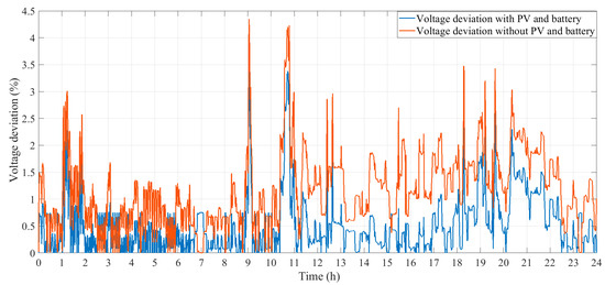 The optimal multi-objective solution of PV-battery sizing while considering the TCO and VD provides the results in Table 3. The PV farm and battery capacity with 2 MWp and 1.27 MWh, respectively, are the optimal solutions with regard to improvement of system performance, system stability, and minimization of the total cost of DG while considering the purchased and sold energy. Figure 12 compares the voltage deviation for one day before and after the implementation of the optimally sized PV farm and BESS.