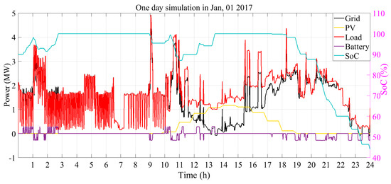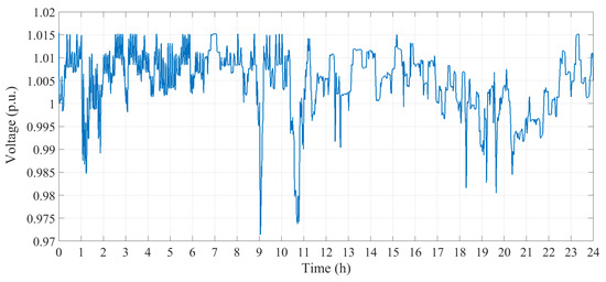 To verify the effectiveness and performance of the proposed FLC controller, the input/output membership functions were introduced to control the charging and discharging rates of the battery bank and facilitating B2G and G2B operations. The objective of controlling the charging and discharging rates is to provide the exact power to the grid respecting voltage, load constraints, and battery characteristics. Uncoordinated charging of batteries threatens the distribution system and it can lead to power outage and undesirable voltage sag [19]. Hence, the real time smart control charging strategy maximizes customer satisfaction and it adjusts both the energy that is delivered by the grid to the battery and the energy that is injected on the grid from the battery, with fair power allocation. To perform energy management, the real time charging and discharging rates could be controlled via proper controllers with the aim of achieving peak shaving and enhancing the battery to be charged during off-peak times and discharged during on-peak times. Figure 13 illustrates the load voltage profile through 24 hours in one-second step time. Moreover, Figure 14 shows the behavior of the load, grid, PV, and SOC in 24 h on January 1st in one farm. The results show that, in winter, the maximum power generation from PV can be 1.2 MW due to low irradiation. In the meanwhile, the supplied power from the grid between 10:00 a.m. and 05:00 p.m. decreases and the battery is charged. During peak hours (e.g., 9 a.m., 7:30 p.m.), corresponding to high load demand (see Figure 2), and when the voltage drops below 0.98, the designed controller incites the battery to discharge, as a ‘High SoC’ (between 81% and 100%) characterizes its SoC. During off-peak hours, (e.g., 2:30 a.m., 3:30 p.m., 23:30 p.m.), and when the voltage is very high (VH), the designed controller incites the battery to charge. In the case of a normal voltage (e.g., 7:30 a.m., 4:30 p.m.), the battery is neither in charge nor in discharge mode. As a result, it can be concluded that the energy management system properly controls the charging and discharging power rates and it enables B2G and G2B services in sizing the DG optimization process. Therefore, the proposed technique provides successful coordination between a RES with PV and ESS with stationary battery.