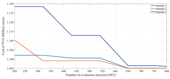 To guarantee the global optimal solution and avoid any local solutions, the optimization process has been run three times, as shown in Figure 15. As it can be seen, after 800 function evaluations, the cost has reached the same value of 1094 × 103 euros. Therefore, it can be concluded that the solution is globally optimum for the defined problem.