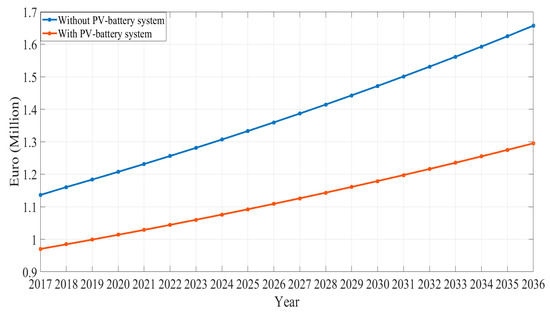 To analyze the economic assessment of the proposed system, the total yearly costs are calculated over 20 years for both cases; without the PV-battery and with the PV-battery system that is optimized by the GA. Subsequently, profitability is obtained based on the calculated yearly costs for both scenarios. Note that different drivers influence the profitability with solar PV and battery storage systems, which are broadly grouped into ‘finance-related’ factors, such as market-based characteristics and DG costs, and ‘quantity-related’ factors, such as the amount of demand and supply and weather conditions [51]. As shown in Figure 16, the proposed system is profitable from the first year. Moreover, Table 4 presents the total yearly profits from PV production while considering a total DG cost of 0.3 Million Euros. The resulted payback time and the yearly profits from PV generation could provide society with an initial indication of economic viability of such systems and incite consumers to purchase PV and battery systems and make the most financially sound investment decision.