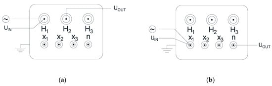 As was already mentioned, FR can be measured in various test configurations, however, according to the standard [6], the main configuration is end-to-end open test setup, where the signal is applied to the beginning of the winding and measured at its end, with remaining windings left open. All results presented in this paper are based on this configuration, which is presented in Figure 1. For delta connected windings, the signal is given on the bushing connected to the beginning of a tested phase and measured at this point (Uin). The second measuring channel is connected to the bushing where the end of the winding in the tested phase is led out (Uout), shown in Figure 1a. In the delta winding configuration, part of the signal is also transferred through both remaining phases. In the case of star connected windings, input voltage (Uin) is measured on bushings connected to the beginning of the tested phase, while output voltage channel (Uout)) is connected to the neutral bushing. The signal is transferred only through the tested winding, however obvious couplings to other windings also appear in FR.