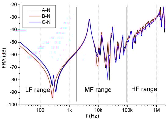 The FRA results are presented as the frequency function in logarithmic scale, allowing analysis of results in each frequency range, but occasionally linear scale is applied. The FR curve shape is mainly determined by winding inductances and capacitances. During assessment, the FR range is usually divided into three main subranges, sometimes including additional sub-bands. These ranges are as follows: low, medium, and high frequencies. Their exact borders depend on the construction of the transformer, mainly on its geometrical size, usually related to its power rating. Therefore, it is not possible to perform analysis in predefined frequency ranges. The bigger the transformer, the higher the values of inner capacitances, thus the frequency response is shifted into lower frequencies [8]. The behavior at the low frequency (LF) range is usually considered as the interaction of the magnetizing inductance and bulk capacitance to the ground of the winding taken under consideration. In the lowest frequency range (starting at 20 Hz, according to [6]), winding inductances are dominant, resulting in a decreasing characteristic. When the first resonance is reached, the dominant influence of the winding capacitances appears (Figure 2), reaching the end of the LF range. This range is strongly influenced by short-circuits between the turns or coils, because the magnetic circuit still influences the response in such low frequencies [17,18,19]. The low-frequency range is often omitted in test result analysis, because it shows natural differences between the three phases, due to various magnetic flux distributions in the middle and side columns of the core, which results in a single or double minimum of the main parallel resonance. This frequency range can also be affected by the previous DC measurements, resulting in core magnetization or by core construction [17,20]. The low frequency range finishes at the inflection point of the increasing capacitive slope of the FR curve until the next series resonance, from which FR analysis usually starts for the medium frequency range. The position of the first resonance depends on the winding self-inductance and total series and shunt capacitances.