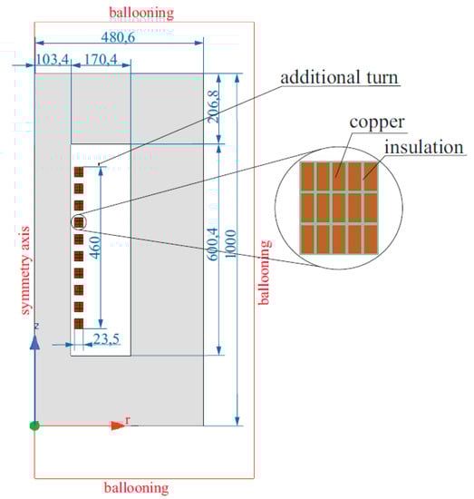 Simulated cross-over winding nominally has 450 turns. Separate models were made to show the influence of changing the position of the tap changer +/- 10% in tapping turn range. These models are similar to the basic one shown in Figure 3, with the difference being that they contain 405 and 495 turns. One section of the winding has been magnified to show that all turns with inter-wire insulation were taken into account during analysis. On the top of the core window, the additional wire provides the connection to the bushing capacitance. This influence of bushings can be modeled as a single element, because during the measurement the winding is seen as a concentrated inductance and capacitance. The treatment as additional wire also allows modification of bushing capacitances [21,22]. On external boundaries, the so-called “ballooning” boundary condition has been stated. It allows one to cut off the region of analysis near to the object.
