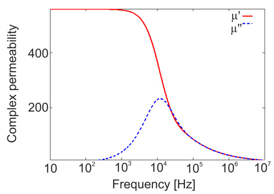 Figure 5 presents complex permeability as a function of frequency. The real part of the complex permeability represents the ability of the core material to conduct the magnetic flux, while the imaginary part represents the core losses caused by eddy currents circulating inside the laminations.
